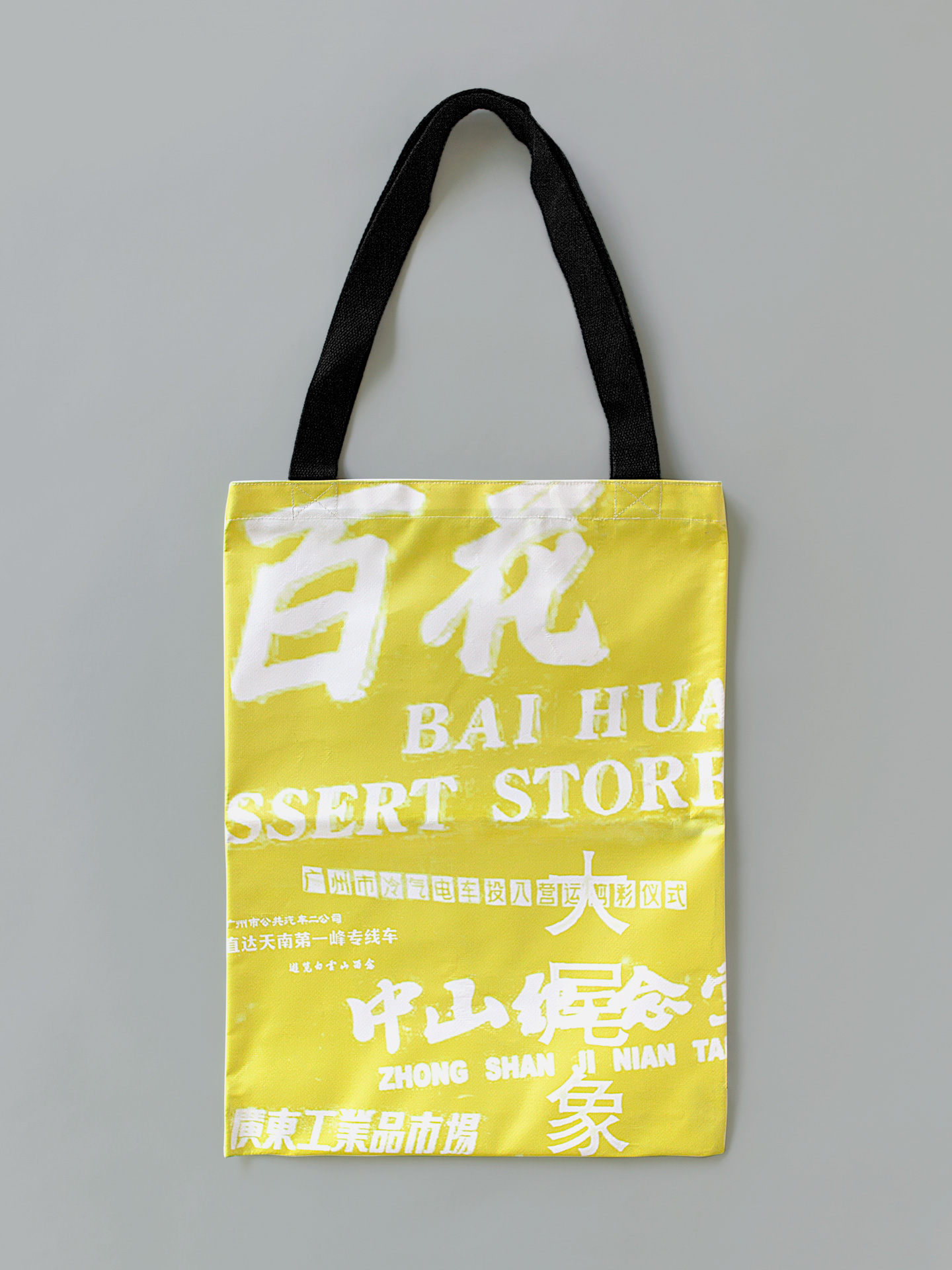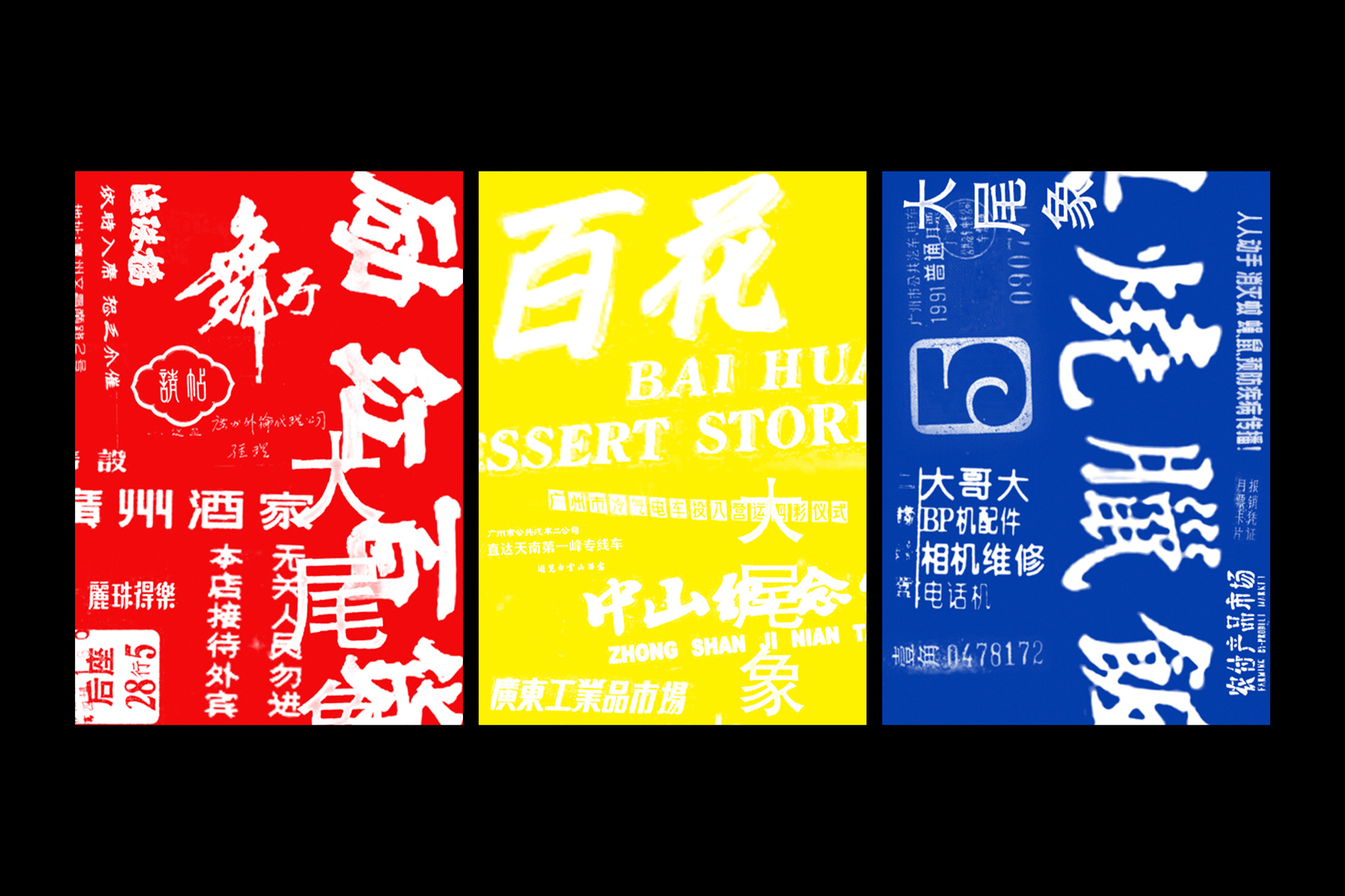 In 1990s, some avant-garde artworks popped up on the streets and stalls of Guangzhou’s downtown, which was a key art feature of Big Tail Elephants, one of the most important art groups in Guangzhou at that time. In 2016, Guangdong Times Museum organized a retrospective for Big Tail Elephants. The design of art derivatives for this retrospective was of great expectations. Restricted by the copyright, the design of art derivatives cannot purely use the artist's work. Therefore, how to connect the artist's work, the memory of the times and the contemporary perception has become a challenge. Echoing the artistic behavior feature of Big Tail Elephants, “popping up” in downtown markets, the design of derivatives used some typography and characters that was shown on the streets in Guangzhou in the 1990s. The derivatives design hopes to follow the footsteps of Big Tail Elephants and rebuild the textures of the history so as to reconstruct how Guangzhou looked like in 1990s in people's minds. By this way, the design tackled the challenge of connection, and evoked, memorized and collected sensations and emotions that created by the unique symbol of "Guangzhou".